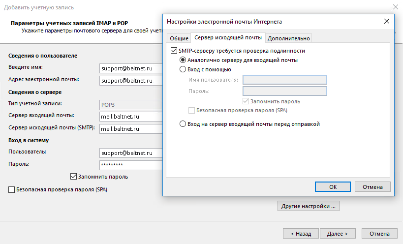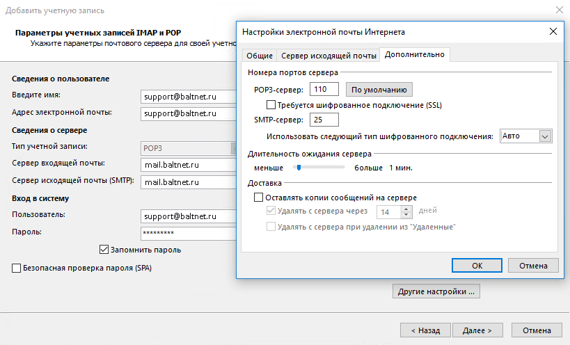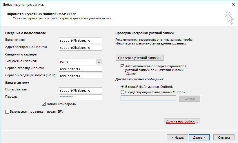 | Адрес электронный почты | Имя почтового ящика, включая логин, @ и домен. На пример: username@baltnet.ru |